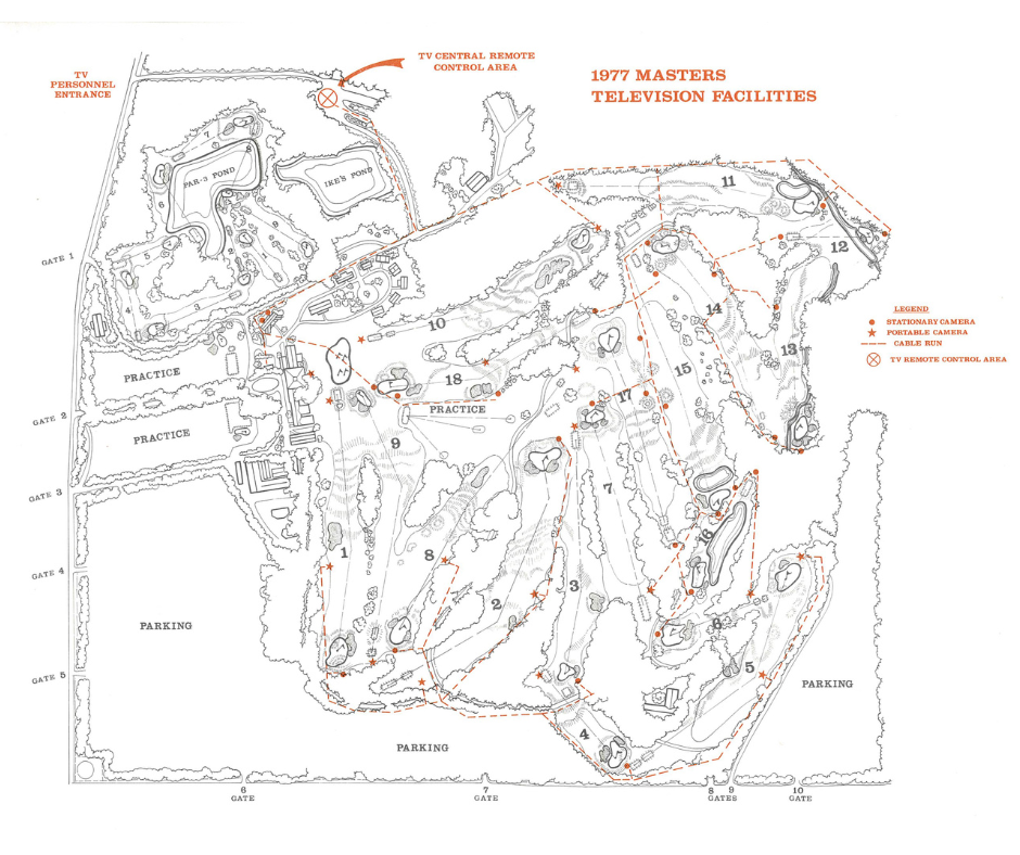 The first telecast used seven cameras, focused almost entirely on the closing stretch: the 15th, 16th, and 17th greens, the 18th fairway, and the 18th green. On Sunday, they added two more cameras on the 15th and 17th fairways and even placed one inside the clubhouse suite of Clifford Roberts.